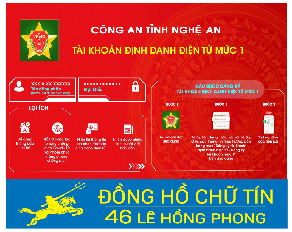 Được sự uỷ nhiệm của Công An tỉnh Nghệ An. Phòng văn hoá truyền thông của TP Vinh. Đồng Hồ Chữ Tín tuyên truyền tài khoản định danh.